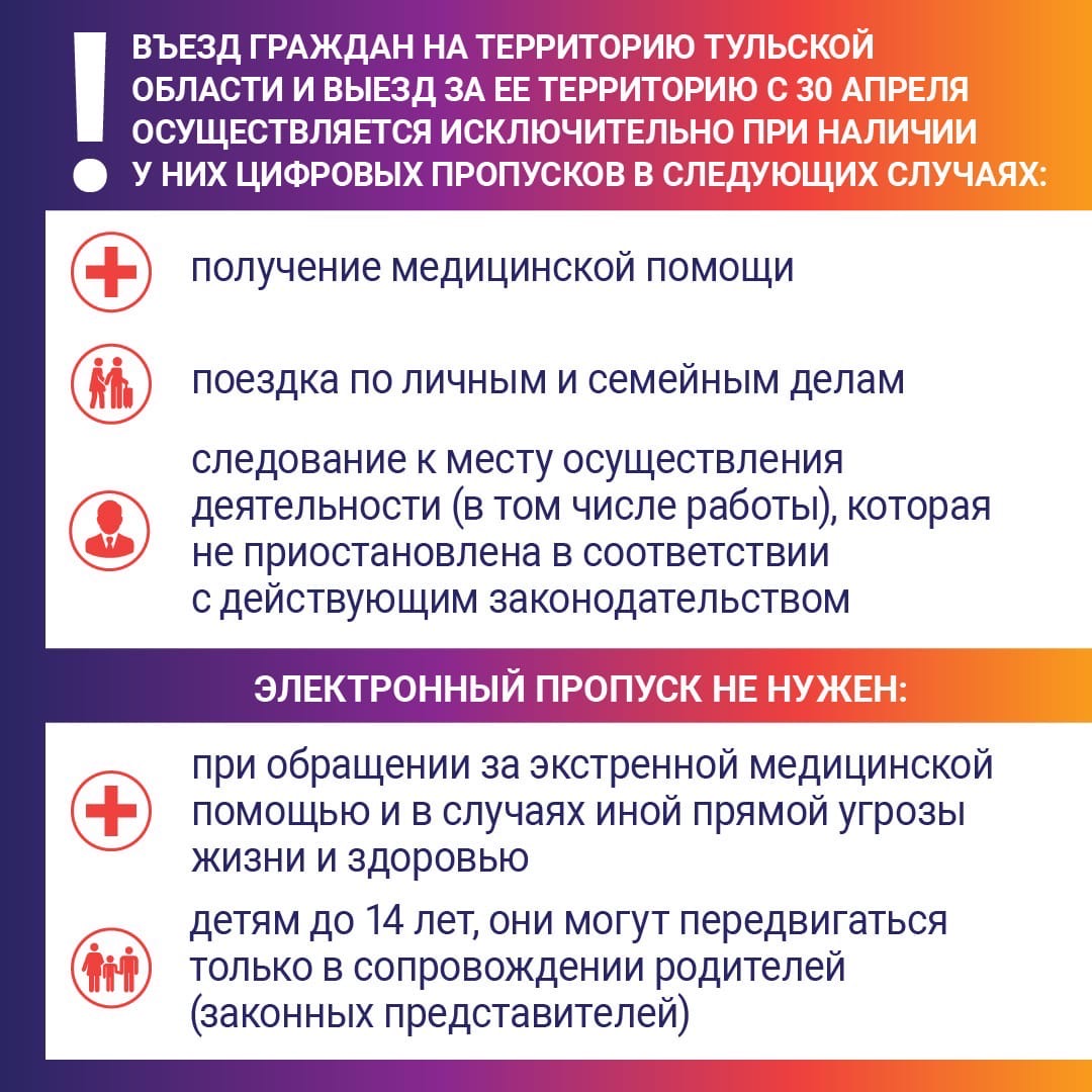 Утром 30 апреля в Тульской области начнет действовать режим цифровых пропусков, введенный для профилактики распространения коронавируса. С четверга для того, чтобы покинуть Тульскую область или приехать в нее, всем гражданам нужно иметь цифровой пропуск.