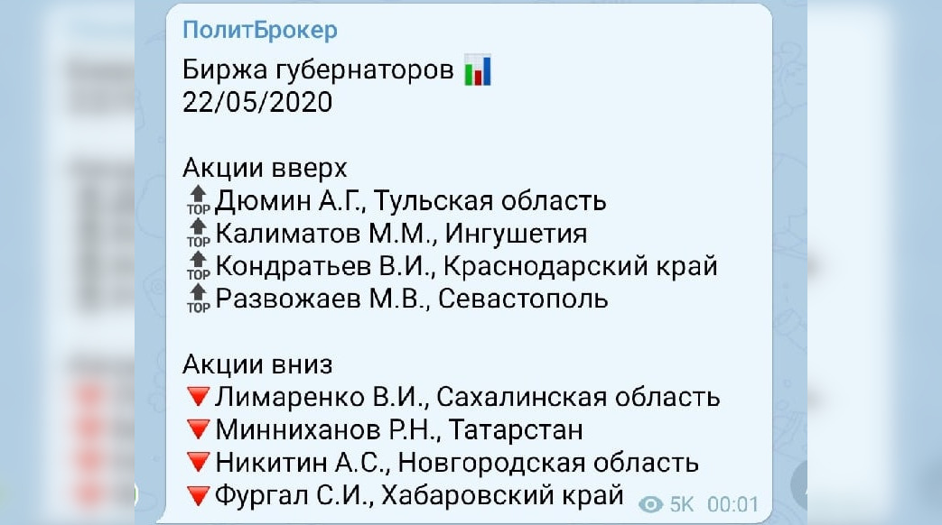 Глава тульского региона Алексей Дюмин укрепил позиции на «бирже губернаторов». По данным telegram-канала «ПолитБрокер» на 22 мая, акции также выросли у главы Ингушетии Махмуда-Али Калиматова, губернатора Краснодарского края Вениамина Кондратьева и врио губернатора Севастополя Михаила Развожаева.