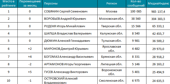 Первое место апрельского медиарейтинга занял мэр Москвы Сергей Собянин, второе — губернатор Московской области Андрей Воробьев, третье — губернатор Тверской области Игорь Руденя, на четвертой строчке — губернатор Калужской области Владислав Шапша.