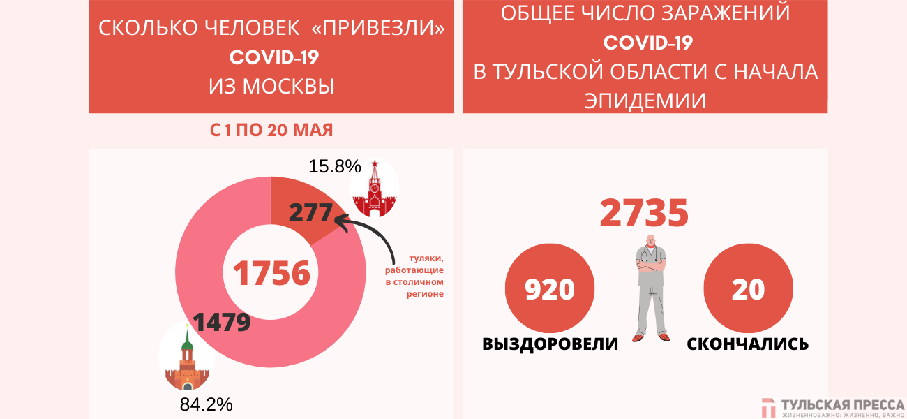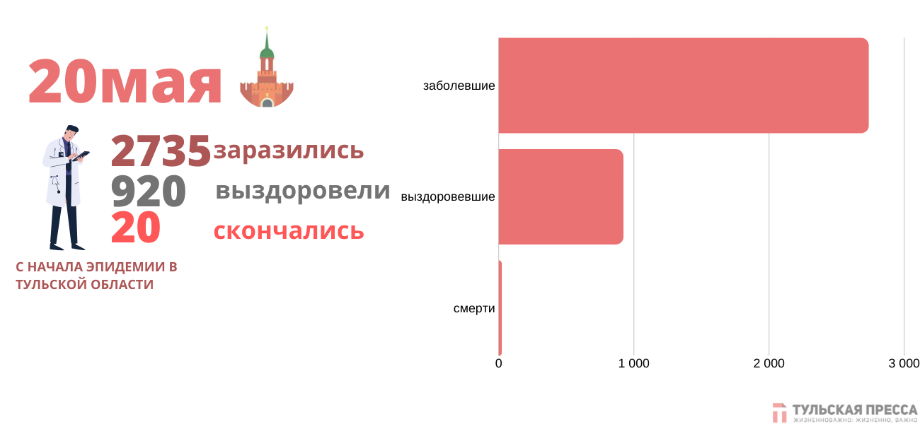 С начала эпидемии в Тульской области коронавирус подтвердили у 2 735 человек. Таковы данные оперативного штаба тульского региона на 20 мая.
