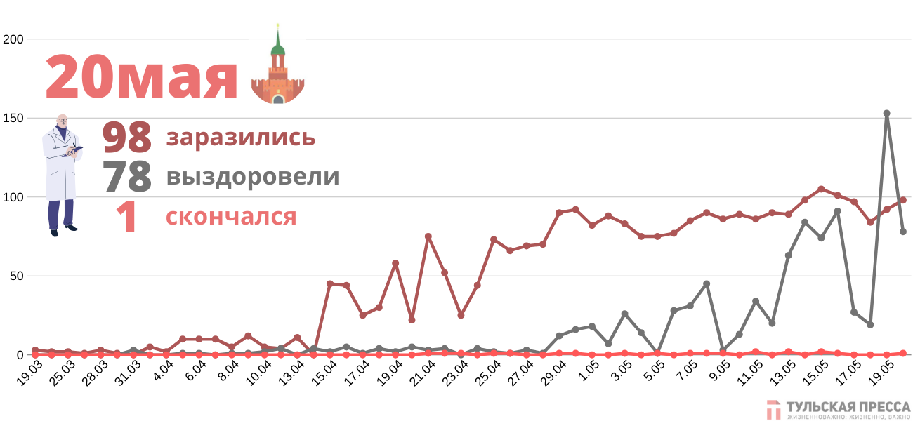 Сейчас Тульская область находится на десятом месте по заболеваемости коронавирусом среди регионов России. Всего к 20 мая в стране выявили 308 705 инфицированных, 85 392 пациентов выздоровели, 2 972 — скончались.