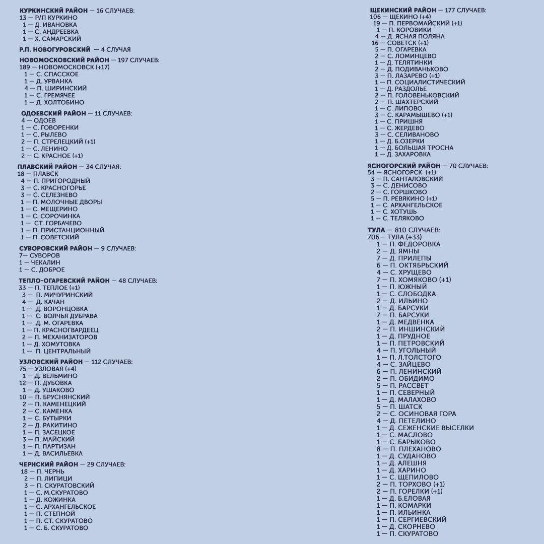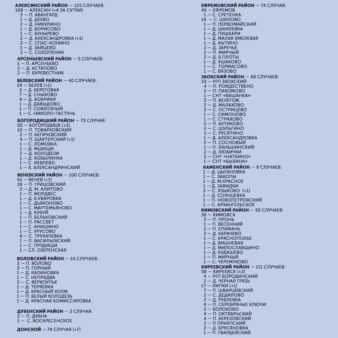 Новых заболевших нашли в Алексине (+4), деревне Александровка (+1), Белеве (+1), Богородицке (+3), Шахтерском поселке (+1), Веневе (+1), Донском (+7), селе Языково (+1), Киреевске (+2), Липках (+1), Новомосковске (+17), поселке Стрелецкий (+1), селе Красное (+1), Теплом (+1), Узловой (+4), Щекине (+4), в Первомайском поселке (+1), Советске (+1), поселке Лазарево (+1), селе Карамышево (+1), Ясногорске (+1), Ревякино (+1).
