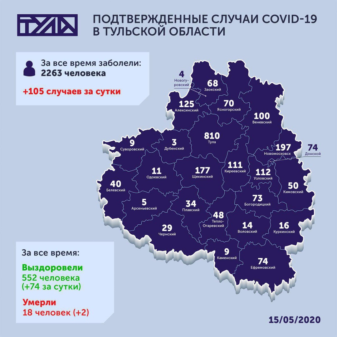 С начала пандемии коронавирусом в Тульской области подтвердили 2263 случая Covid-19. По данным оперативного штаба на 15 мая, за сутки в тульском регионе зарегистрировано рекордно высокое число новых зараженных коронавирусом — 105 человек.