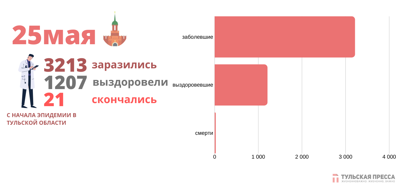К 25 мая число зараженных России достигло 353 427. В Тульской области Covid-19 диагностировали у 3213 человек. Только за последние сутки в тульском регионе зарегистрировали 111 новых случаев — это новый антирекорд в регионе с начала пандемии, предыдущий был зафиксирован 15 мая — 105 человек.
