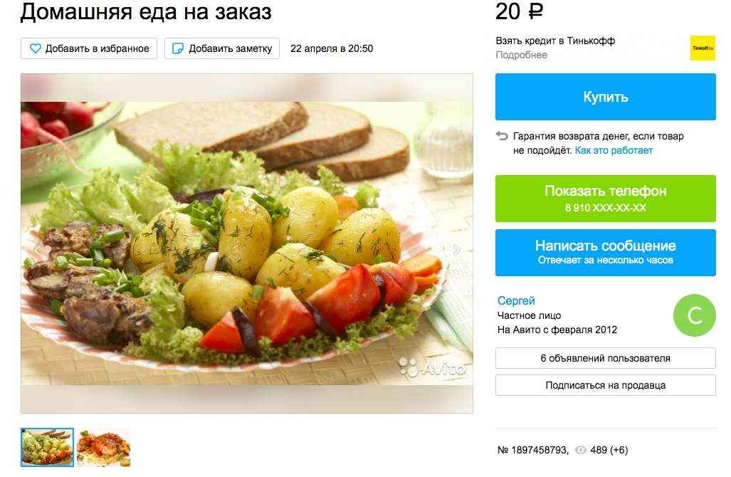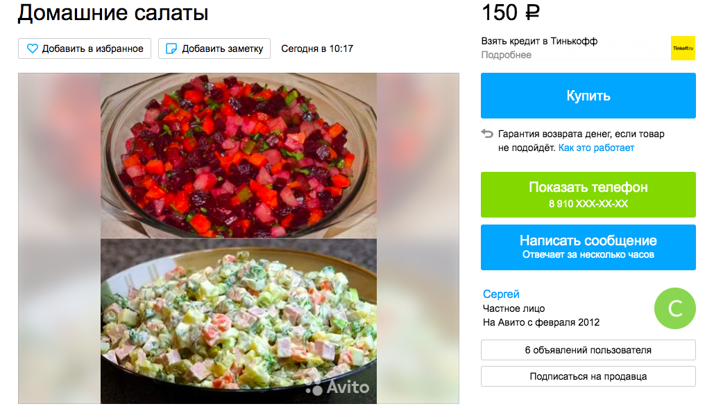 Цена в 20 рублей, указанная на сайте, не кажется реальной: продавец предлагает целое меню домашней еды — от борща и рассольника и до канапе и фаршированных помидоров. Блюда готовят под заказ, за 1-2 дня в зависимости от количества и сложности.