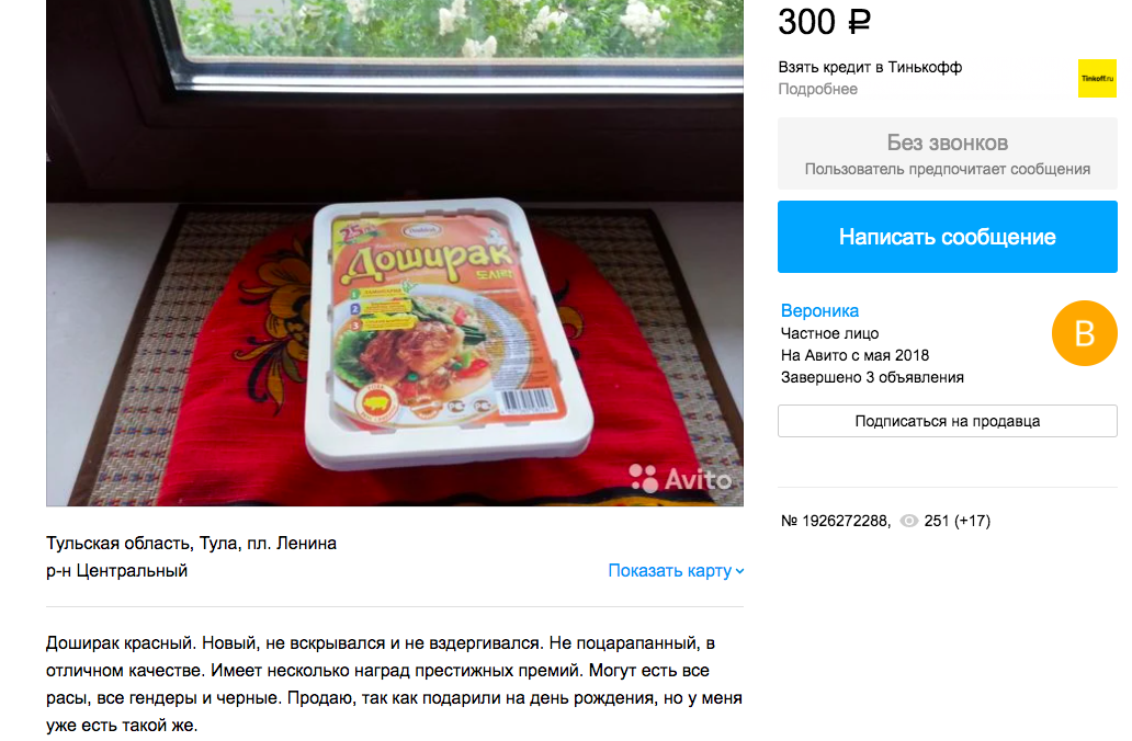 «Новый, не вскрывался и не вздергивался. Не поцарапанный, в отличном качестве. Имеет несколько наград престижных премий. Могут есть все расы, все гендеры и черные. Продаю, так как подарили на день рождения, но у меня уже есть такой же»
