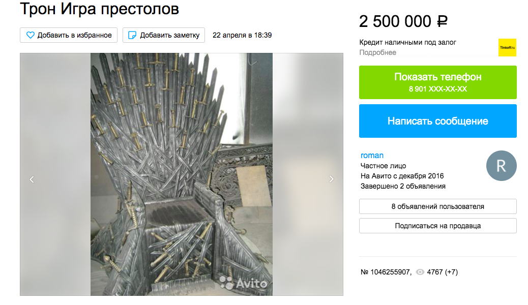 Также туляки могут купить трон из «Игры Престолов» ручной работы.