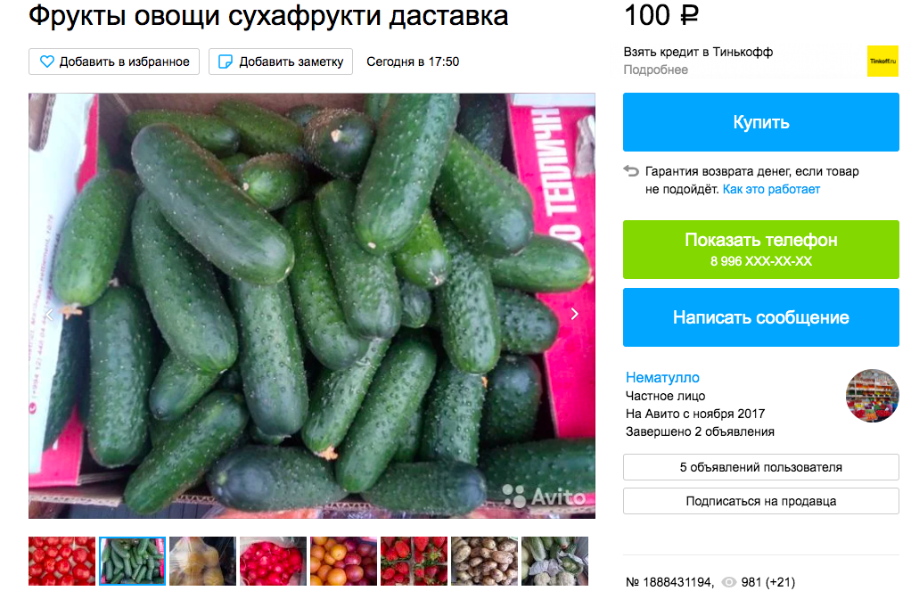 За 15 рублей на сайте можно купить пучок укропа, петрушки, кинзы или лука. По заверениям продавца, зелень свежая и была выращена на собственном огороде без «химии». Хрен, выкопанный 17 мая, на «Авито» стоит дороже — по 150 рублей за килограмм. А за 250 рублей туляки могут купить трехлитровую банку домашнего компота.