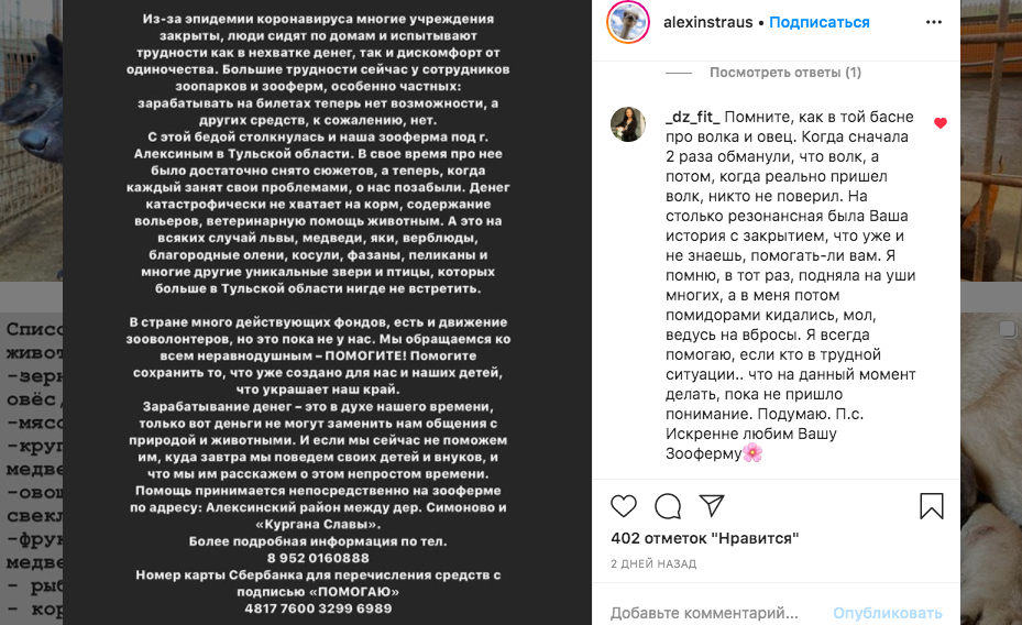 «Большие трудности сейчас у сотрудников зоопарков и зооферм, особенно, частных: зарабатывать на билетах теперь нет возможности, а других средств, к сожалению, нет. С этой бедой столкнулась и наша зооферма под городом Алексином в Тульской области»