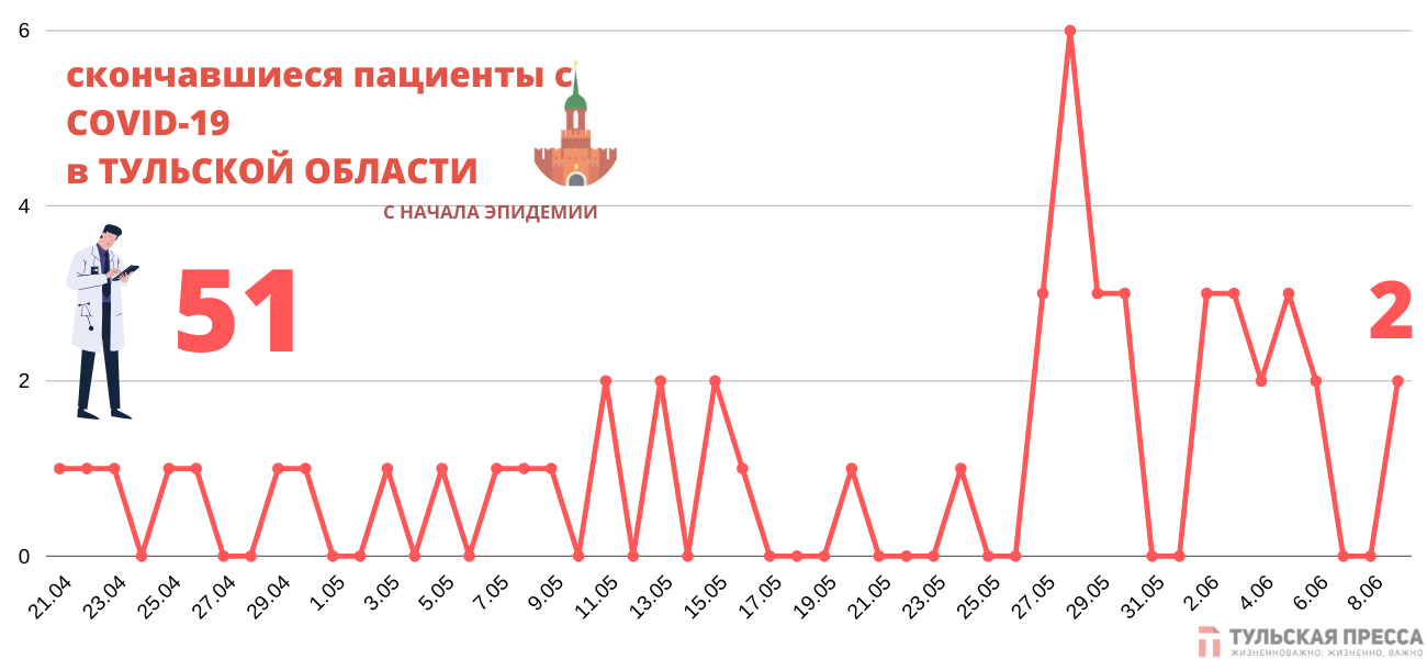 Общее число смертей от коронавируса с начала пандемии в Тульской области превысило полсотни. По данным регионального оперативного штаба на 9 июня, за последние сутки в Тульской области от Covid-19 скончались двое человек.