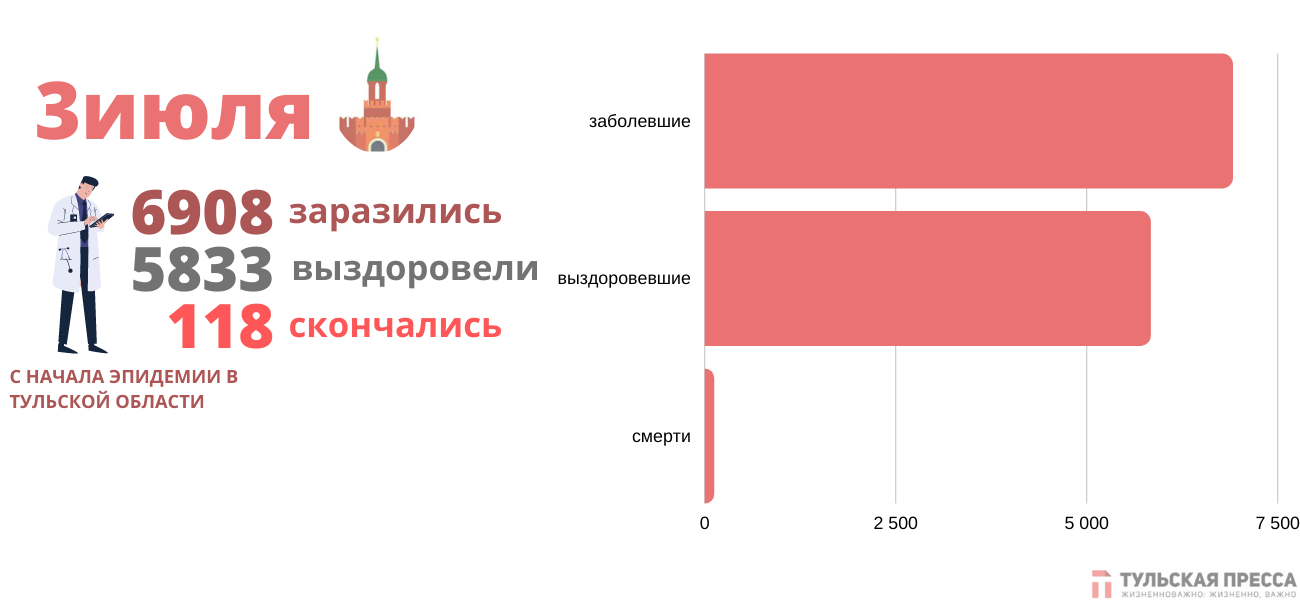 Общее число заболевших с начала пандемии коронавируса в Тульской области достигло 6908 человек. Сейчас регион находится на 13-м месте среди субъектов России по количеству зараженных.