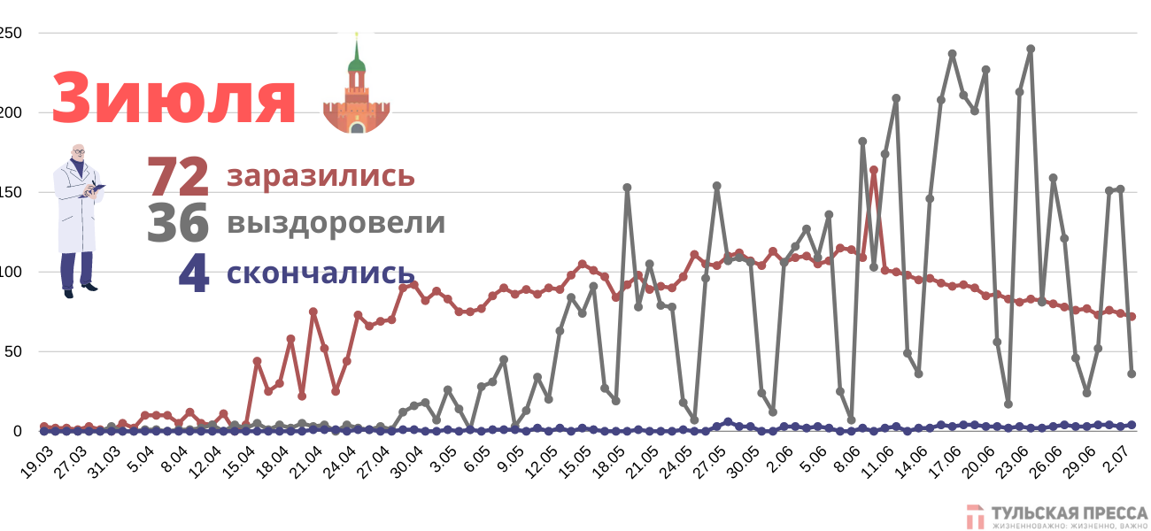 С начала пандемии в Тульской области выздоровели 5833 пациента с COVID-19, 118 человек скончались. За последние сутки лечение успешно прошли 36 жителей Тулы и других районов области. Четыре пациента из Донского, Новомосковска, Одоева и Щекинского района скончались.