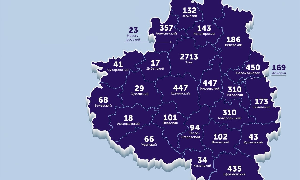 В целом с начала пандемии среди муниципальных образований Тульской области лидируют Тула (2713 заболевших), Новомосковск (450 заболевших), Киреевский (447 заболевших) и Щекинский районы (447 заболевших), а также Ефремовский район (435 заболевших).