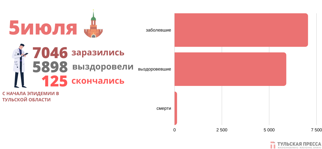 Напомним, также за сутки в Тульской области от COVID-19 вылечился 31 житель региона, трое — скончались. Общее число заболевших с начала пандемии достигло 7 тысяч человек (7046), 5898 из них выздоровели, 125 пациентов скончались.
