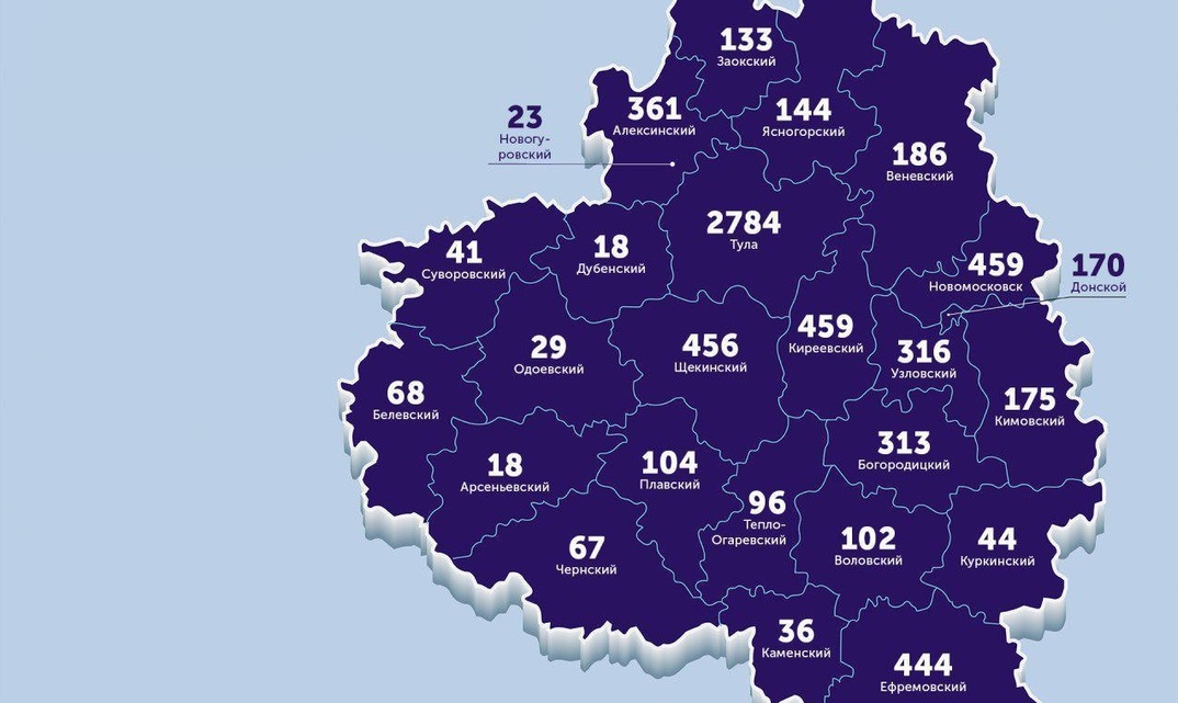 С начала пандемии коронавируса среди муниципалитетов Тульской области лидируют Тула (2784), Новомосковск (459), Щекинский (456) и Ефремовский район (444).