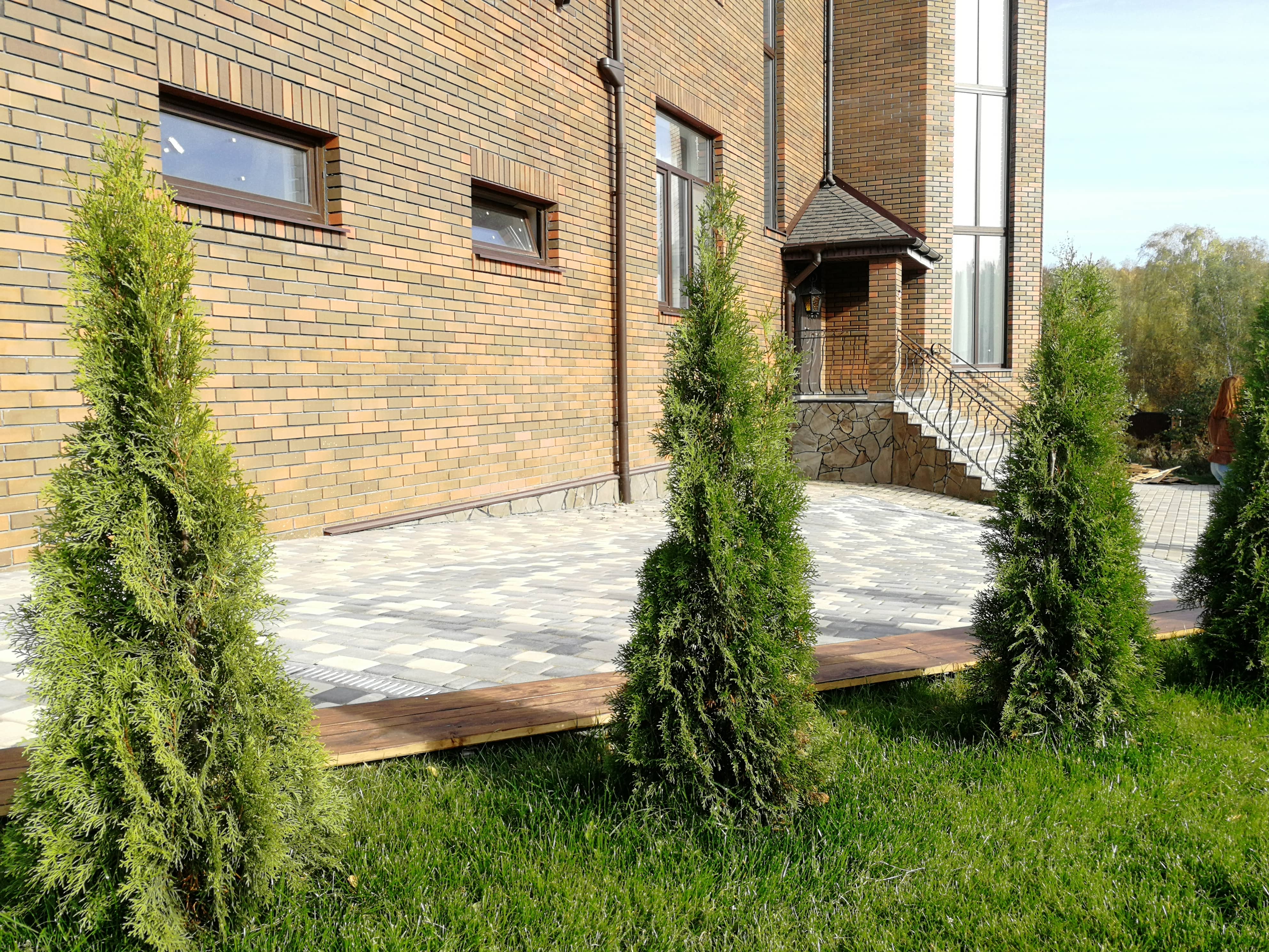 Помимо кирпича в благоустройстве участка использовалась также тротуарная плитка «Браер» из коллекции «Классико круговая» цвет «Туман». Хозяин поделился с нами историей о том, как он убедился в отменном качестве приобретенных материалов:
