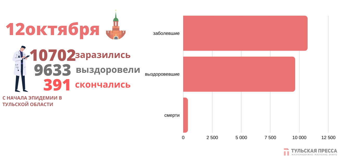 Напомним, по последним данным, с начала пандемии в тульском регионе от коронавируса скончался 391 пациент, общее число заражений — 10 702, 9 633 человек выздоровели.