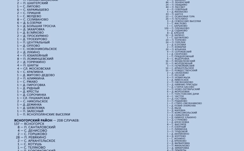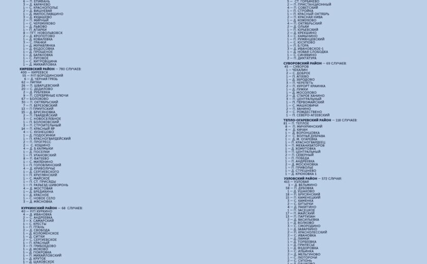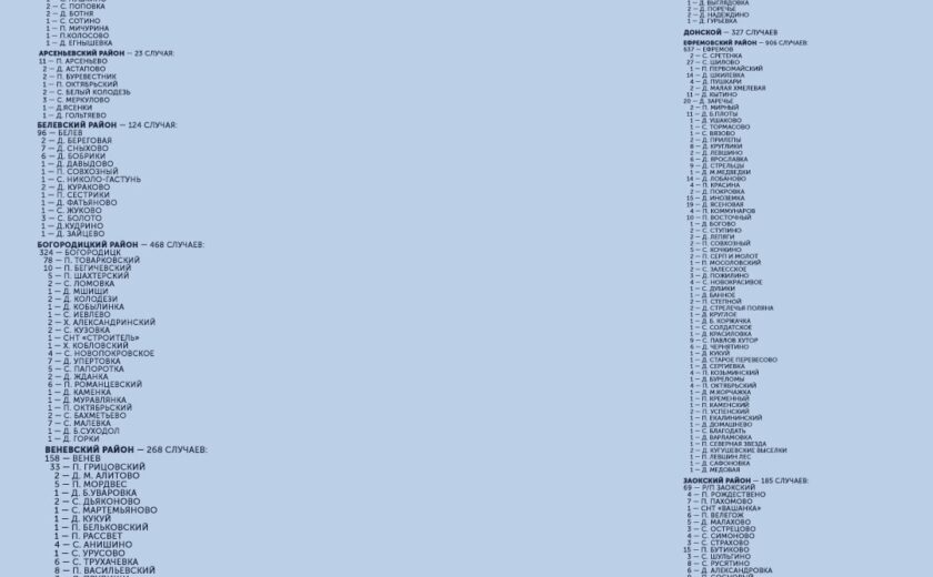С начала пандемии большего всего заболевших выявлено в Туле (5 983), Ефремовском районе (906), Новомосковске (896) и Киреевском районе (780). Меньше всего — в Арсеньевском районе (23) и рабочем поселке Новогуровский (42).