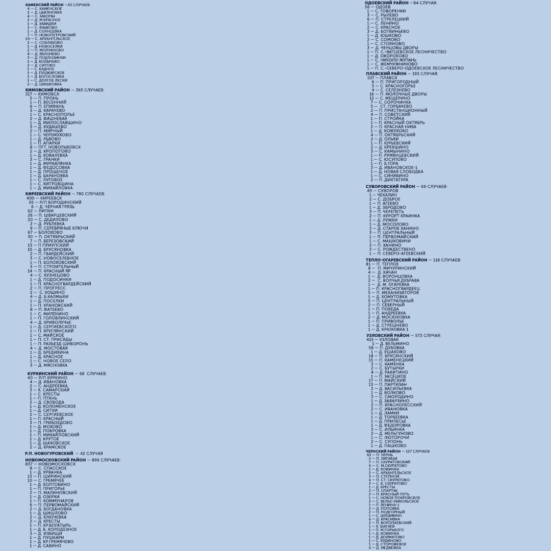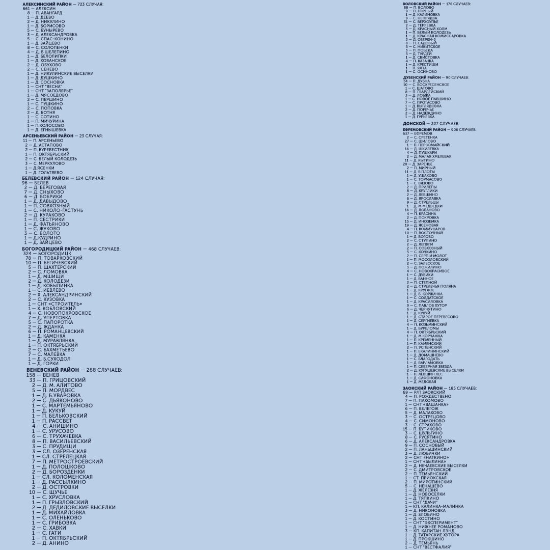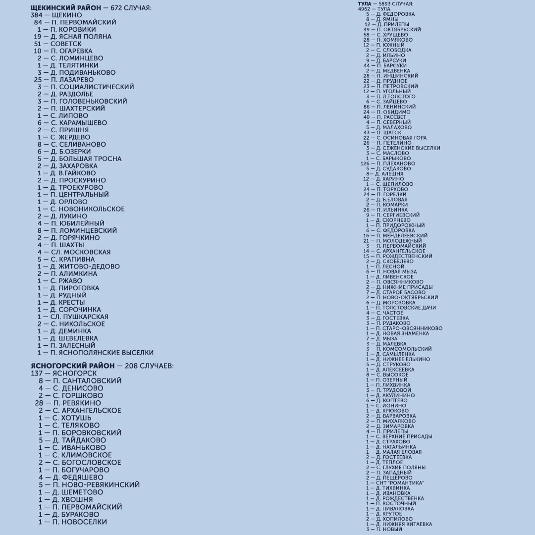 С начала пандемии большего всего заболевших выявлено в Туле (5 983), Ефремовском районе (906), Новомосковске (896) и Киреевском районе (780). Меньше всего — в Арсеньевском районе (23) и рабочем поселке Новогуровский (42).