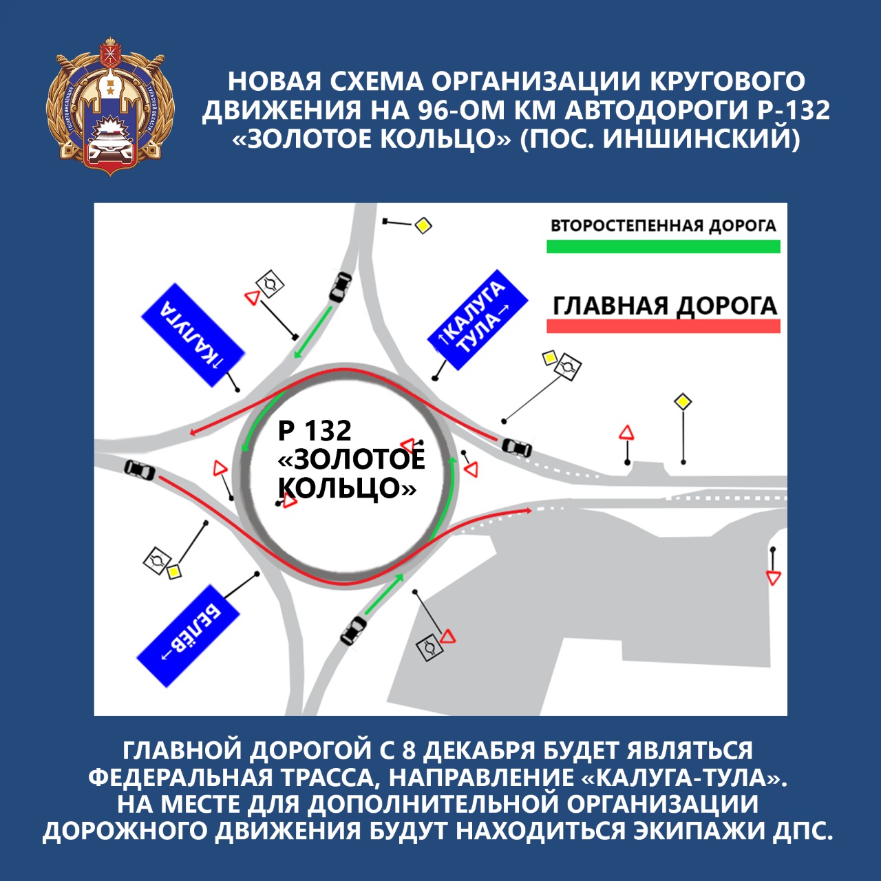 С 8 декабря на трассе Р-132 «Золотое кольцо» (ранее «Калуга-Тула-Михайлов-Рязань») изменят схему кругового движения. По данным региональной Госавтоинспекции, речь идет о 96-м километре автодороги у поселка Иншинский.