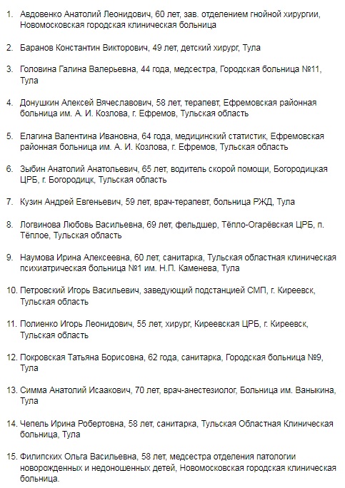 Кроме них, в «Списке памяти» значатся еще 15 тульских медиков.