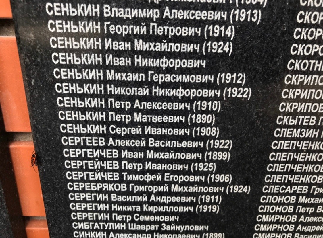 В моей семье дед Петр Матвеевич Сенькин – командир партизанского отряда погиб в 1941 году, защищая Тулу. Его фамилия, наряду с тысячами дубенцев, павших смертью храбрых в боях за освобождение родной земли, высечена на мемориальной доске у Вечного огня в Дубне.