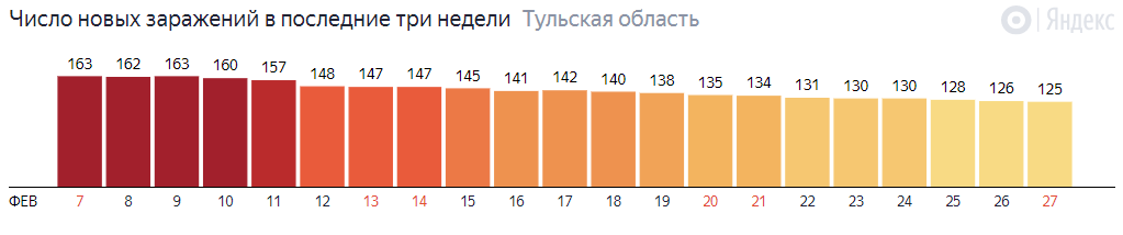 В Тульской области за последние сутки зарегистрировали 125 случаев коронавирусной инфекции. Обновленные данные по заболевшим опубликованы федеральным оперштабом 27 февраля.