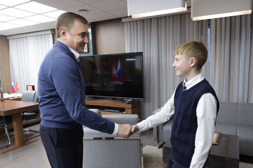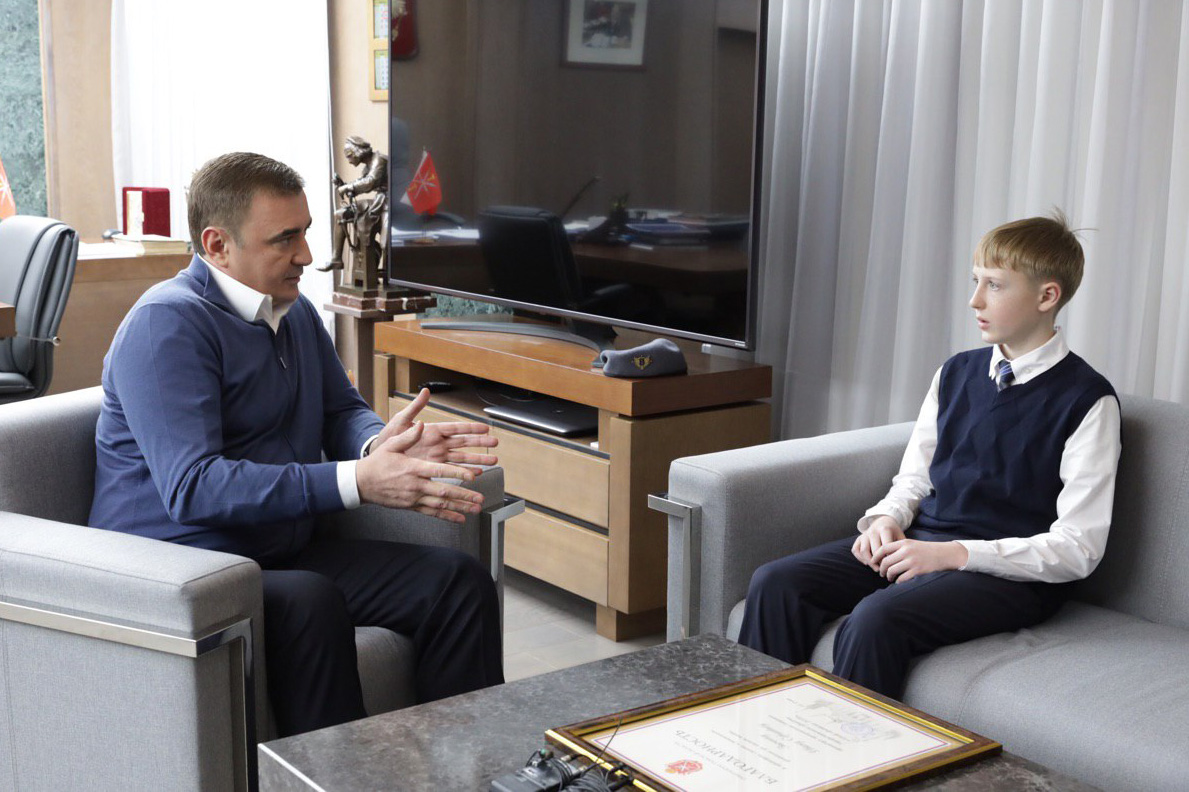 Губернатор Тульской области встретился с 13-летним Иваном Зиминым и его отцом Сергеем. Напомним, в январе мальчик спас сноубордиста на сочинской «Красной Поляне». Туляк заметил упавшего в снежную яму спортсмена, очистил лицо его от снега, и позвал на помощь. 9 февраля Алексей Дюмин лично поблагодарил семиклассника из Тулы за смелый поступок, а его родителей — за правильное воспитание ребенка.