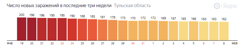 По данным федерального оперативного штаба на 8 февраля, всего с начала пандемии в Тульской области отмечено 30 253 заразившихся новой коронавирусной инфекцией. Число выписанных пациентов с ранее подтвержденным COVID-19 за сутки в регионе выросло на 181 и достигло 27 652.