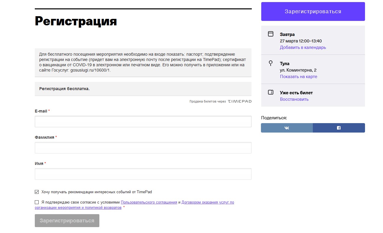 Выбрав нужный блок, вы регистрируетесь в специальном поле — заполняете ФИО и адрес электронной почты. Затем вам на e-mail придет предварительное подтверждение об участии. Вместе с ним вы приходите на мероприятие.