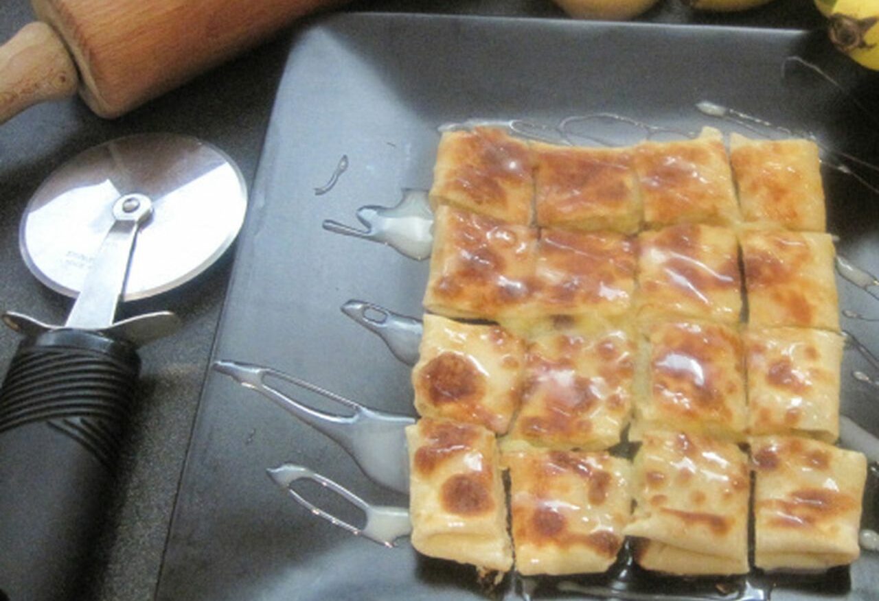 Каждый шарик раскатать скалкой как можно тоньше – тесто должно стать прозрачным. И отправить на разогретую сковороду с 1 ст.л. растительного масла. Бананы нарезать кружочками и выложить на центр блина. Сложить блин конвертиком и перевернуть. Готовить еще секунд 30.