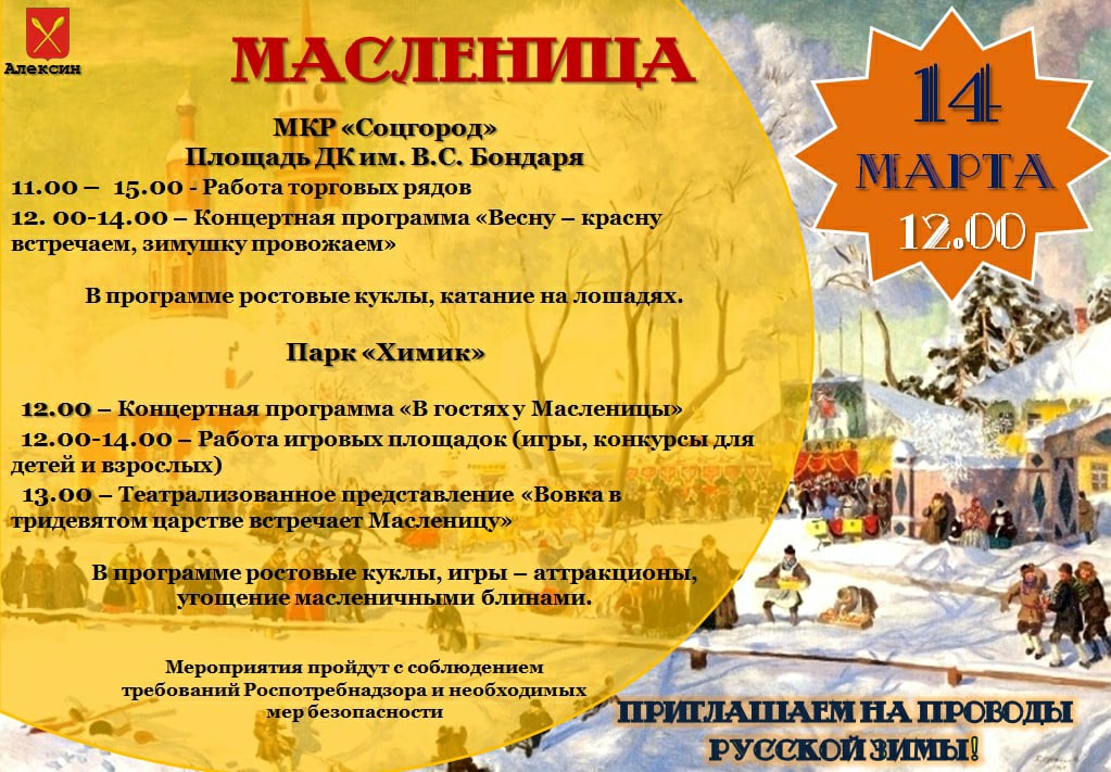 14 марта в Алексине проводят зиму. Одной из локаций станет обновленный по программе «Формирование комфортной городской среды» парк «Химик». Гостей праздника ждёт концертная программа «В гостях у масленицы», театрализованное представление «Вовка в тридевятом царстве встречает масленицу», а также конкурсы, игры для детей и взрослых, ростовые куклы. По традиции всех желающих угостят блинами.