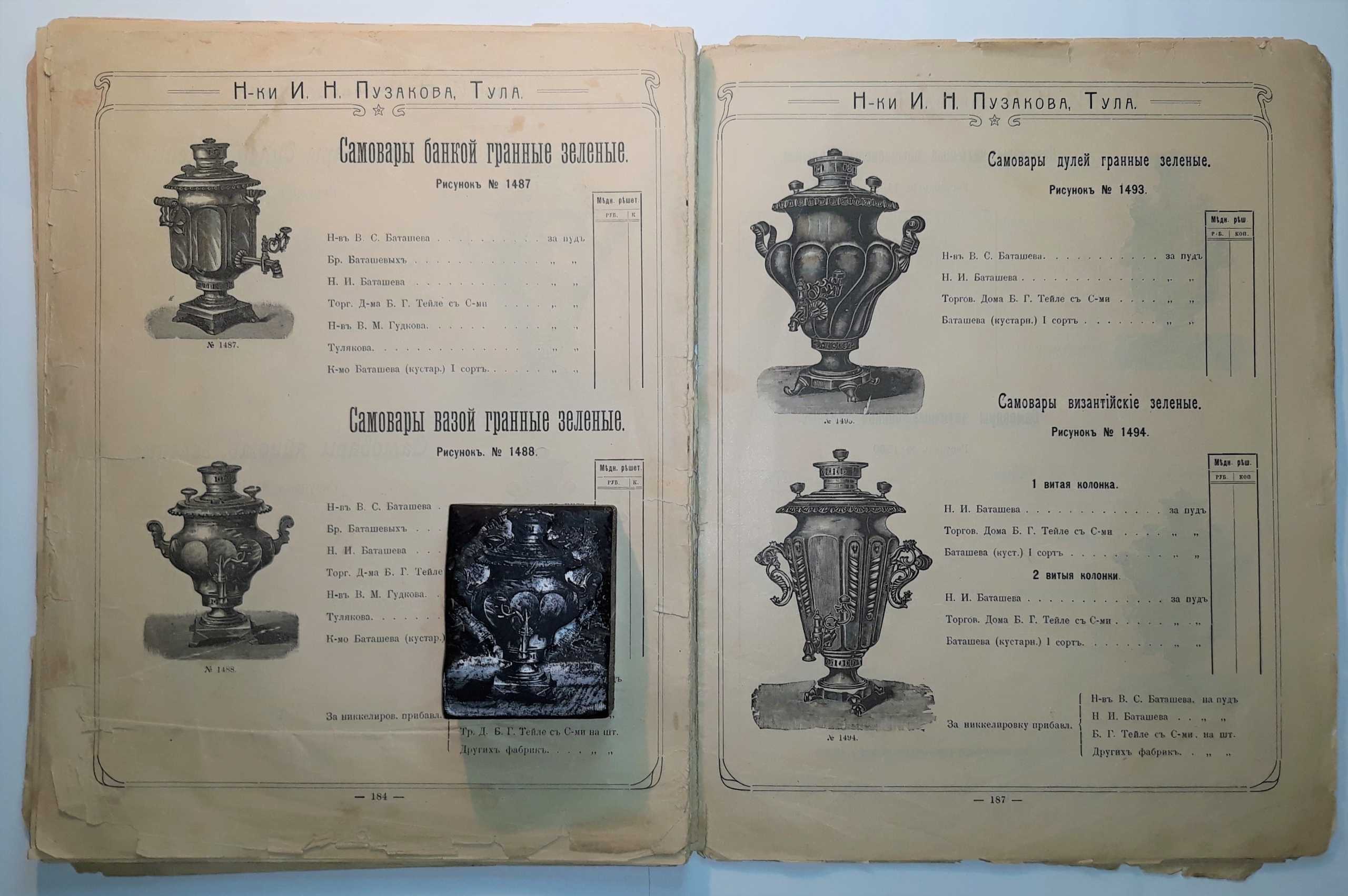 Этот кусочек дерева оказался резным клише, которое использовалось для печати того самого прейскуранта. Коллекционер отмечает, что использовалось клише сразу для двух рисунков — «Самовары вазой гранные зеленые. Рисунок №1488» и «Самовары четочные, вазой, гранные, зеленые. Рисунок №1505».