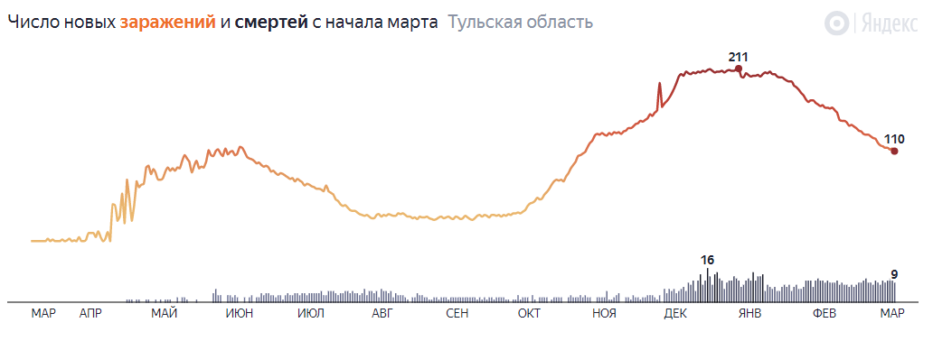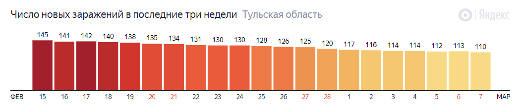 По данным федерального оперштаба, за последние сутки в Тульской области выявлены 110 случаев коронавируса. При этом, общее число заболевших COVID-19 в регионе к 7 марта выросло до 33 836 человек.