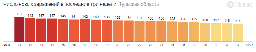 В Тульской области за последние сутки зарегистрированы 114 случаев коронавируса. Данные на 3 марта были опубликованы федеральным оперштабом.
