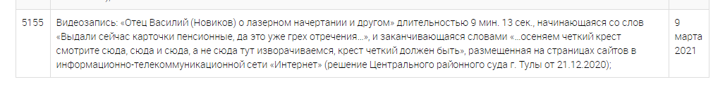 9 марта Минюст России внес в список экстремистских материалов десятиминутный ролик «о лазерном начертании и другом» с рассуждениями основателя секты «В честь Иконы Божьей Матери «Державная» — запрещенной в России организации. Решение о признании материала экстремистским принял Центральный районный суд Тулы в декабре 2020 года. Отныне публичное демонстрирование видеоролика с отцом Василием (Новиковым) запрещено и подпадает под действие ст. 20.29 КоАП РФ.