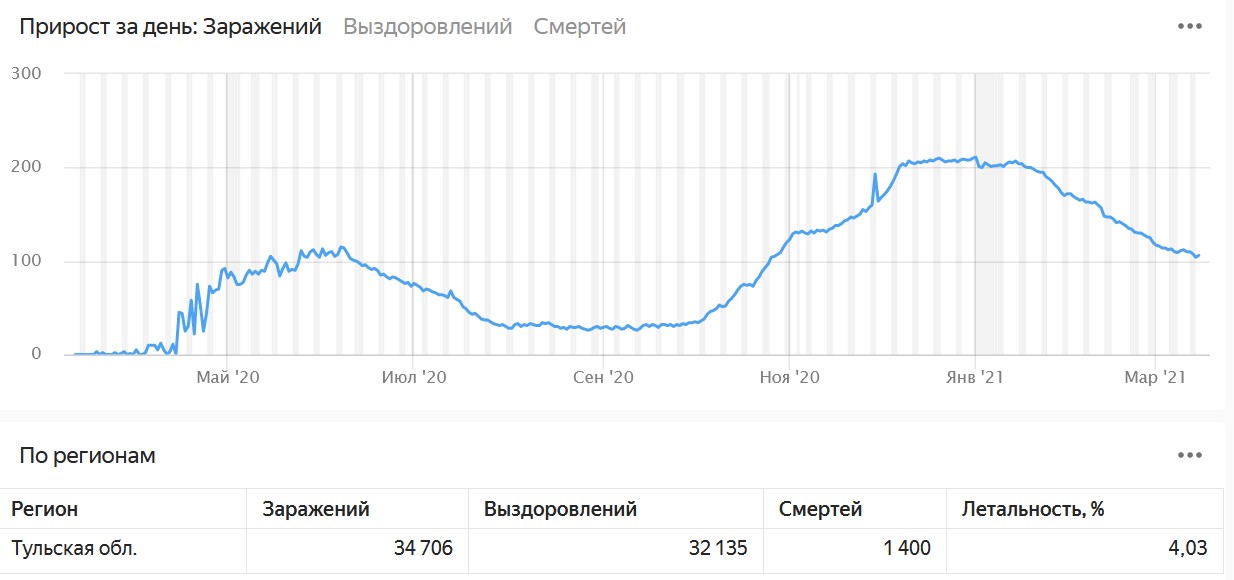 Всего с начала пандемии 34 706 туляков переболели коронавирусом. Для 1400 пациентов болезнь стала смертельной.