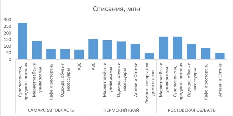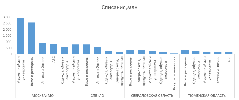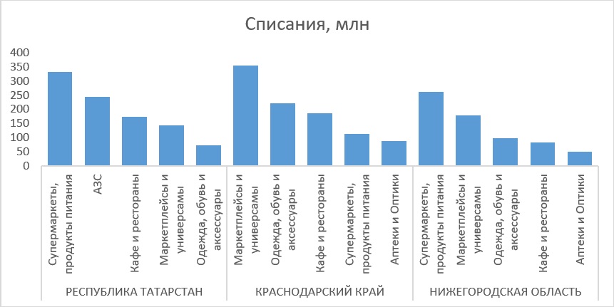 В топ-10 по активному списанию бонусов попали следующие регионы: Свердловская область (1 068 млн), Тюменская область (975 млн), Республика Татарстан (965 млн), Краснодарский край (963 млн), Нижегородская область (670 млн), Самарская область (653 млн), Пермский край (605 млн) и Ростовская область (602 млн). В этих регионах живут наиболее вовлечённые клиенты, которые активно используют предложения «СберСпасибо» и списывают бонусы.