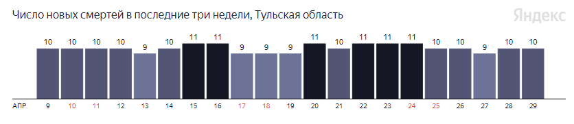 В Тульской области антирекорд по летальным случаям от COVID-19 был зафиксирован в апреле 2021 года. За неполный месяц в регионе зарегистрировали 295 смертей пациентов с подтвержденной инфекцией. С начала этого месяца в сутки регистрировалось не менее 9 смертей.