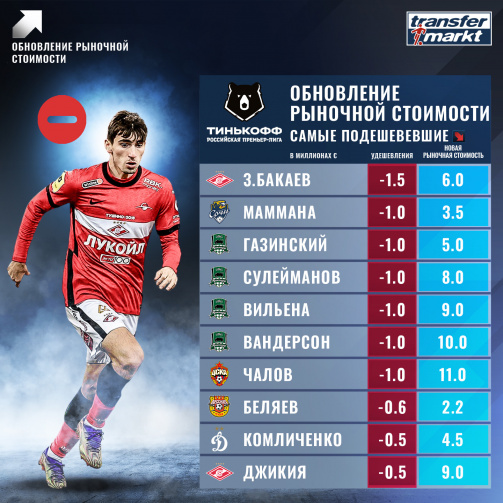 Защитник тульского «Арсенала» Максим Беляев попал в список самых подешевевших футболистов. По данным портала Transfermarkt, его стоимость упала на 600 000 евро и теперь составляет 2,2 млн евро.