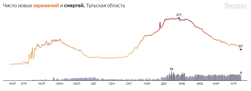Подтверждены еще 68 смертей от коронавирусной инфекции. Возраст скончавшихся пациентов — от 43 до 93 лет, у большинства из них в анамнезе — хронические заболевания. Всего в Тульской области от осложнений, вызванных COVID-19, умерли 1 737 пациентов.