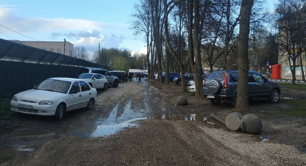 Ограничительные сферы, призванные не допустить именно такие случаи, оказались отброшены в сторону трамвайных путей, а грязь перенеслась на пешеходный тротуар. По мнению автора, состояние территории говорит об острой нехватке парковочных мест.