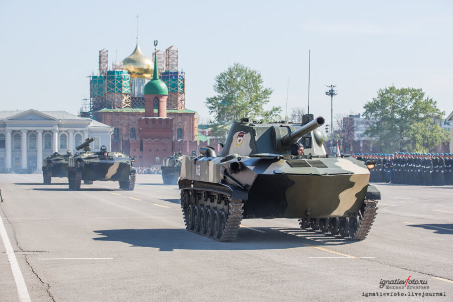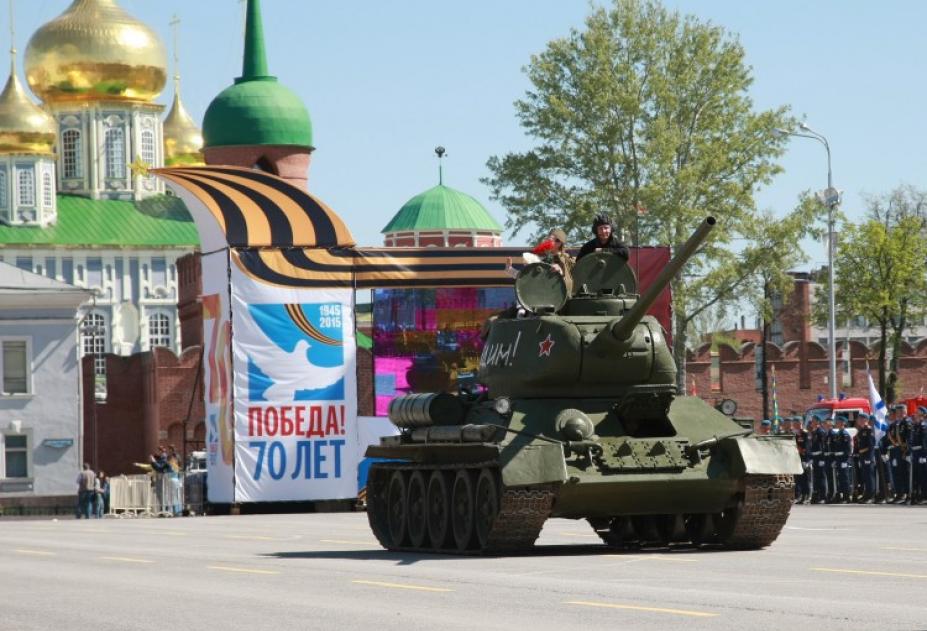 В день 70-летия Великой Победы по главной площади Ленина проехали легендарные танк Т-34 и гвардейский реактивный миномет «Катюша». Зрителями грандиозного военного парада стали, по подсчетам областного правительства, 55 тысяч человек. Фотография — пресс-служба правительства Тульской области.