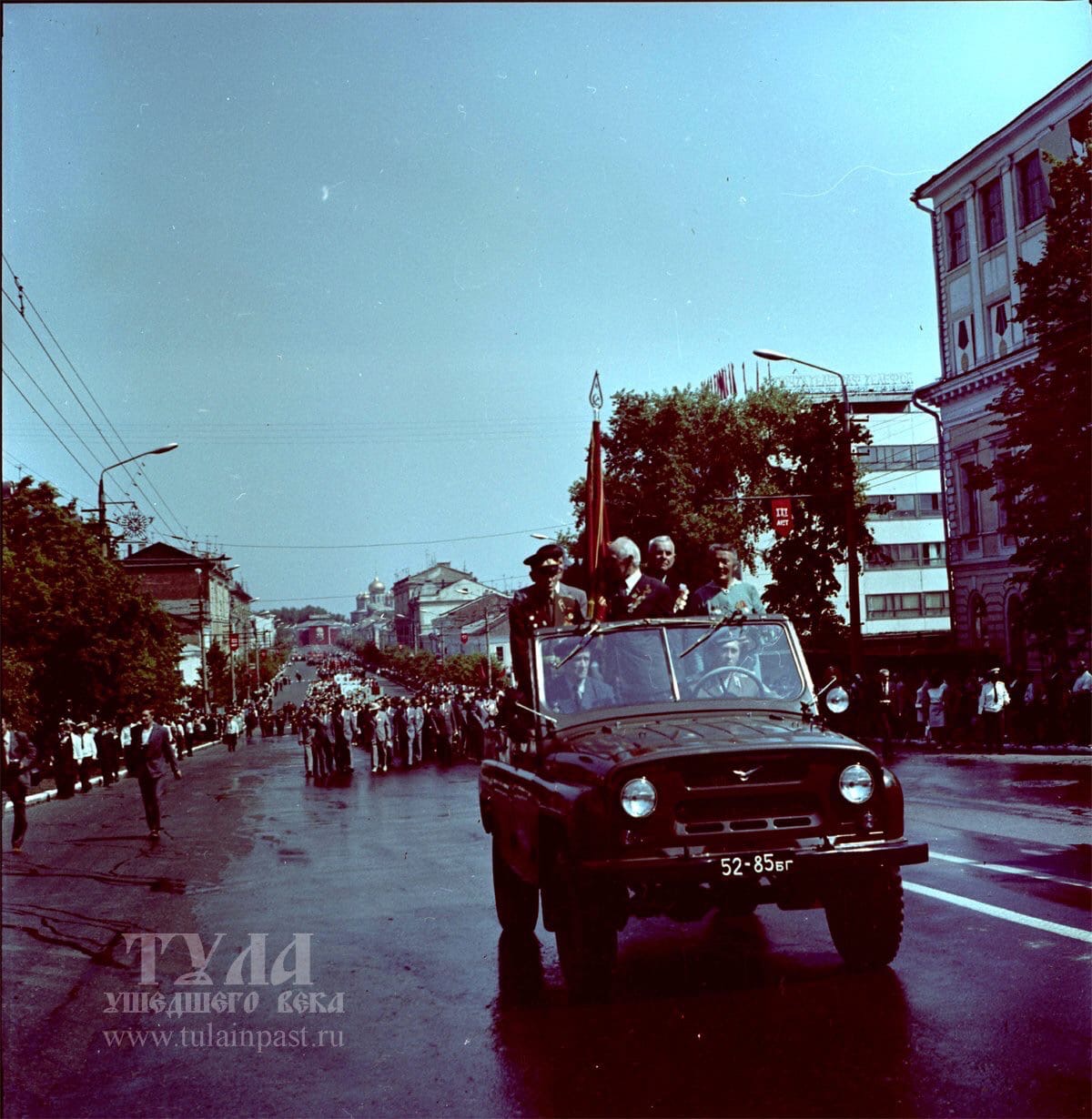 В этот день по проспекту Ленина прошло праздничное шествие. В УАЗе на фотографии, рядом с водителем — Василий Гаврилович Жаворонков, председатель Тульского городского комитета обороны в 1941 году. Фотограф — Николай Мельников («Тула ушедшего века»).