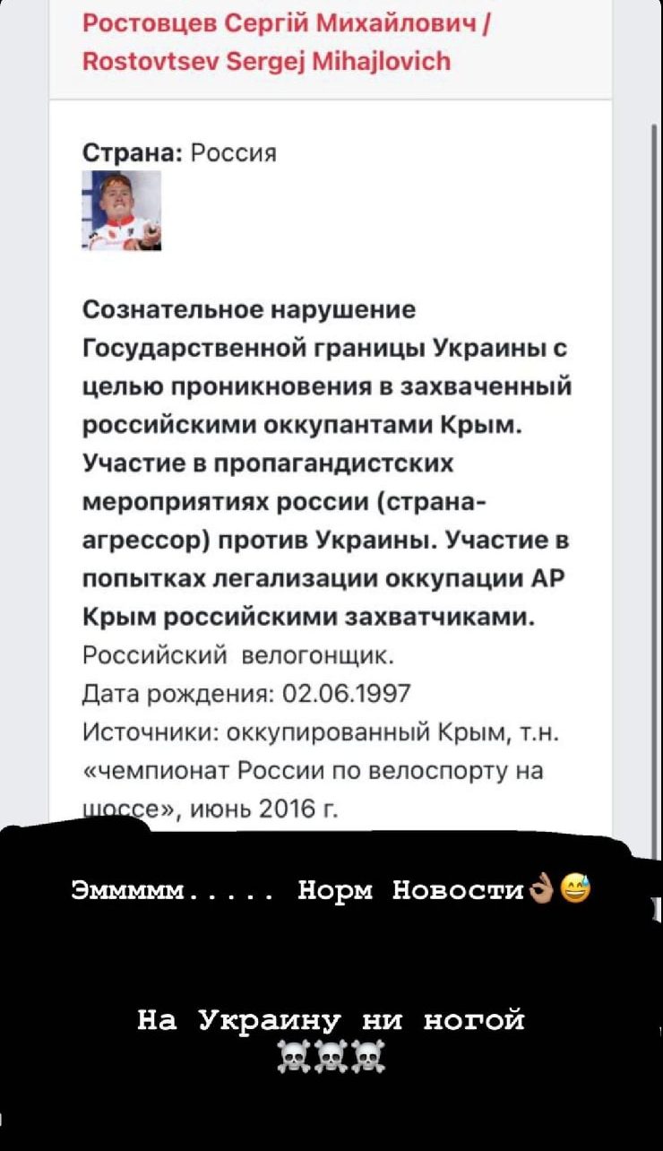 На сайте «Миротворец» сказано, что Ростовцеву запрещен въезд за «сознательное нарушение государственной границы Украины с целью проникновения в захваченный российскими оккупантами Крым. Участие в пропагандистских мероприятиях России (страна-агрессор) против Украины. Участие в попытках легализации оккупации АР Крым российскими захватчиками».