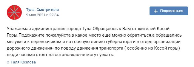 Туляки, живущие в поселке Косая Гора пожаловались на проблемы с общественным транспортом. Косогорцы обращались и к перевозчикам, и в отдел организации дорожного движения, и на горячую линию губернатора, однако ситуация не нормализовалась. Как сообщают в паблике «Тула. Смотрители» пассажиры стоят на остановках часами.