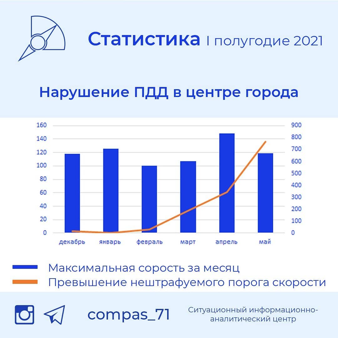Ситуационный информационно-аналитический центр «Компас» подготовил статистику дорожной ситуации в Туле в период с января по май 2021 года. Так, на основе данных об интенсивности движения, эксперты пришли к выводу, что с начала года водители стали чаще превышать допустимый порог скорости (80 км/ч).