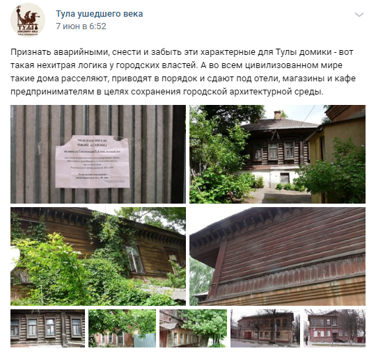 «Признать аварийными, снести и забыть эти характерные для Тулы домики — вот такая нехитрая логика у городских властей. А во всем цивилизованном мире такие дома расселяют, приводят в порядок и сдают под отели, магазины и кафе предпринимателям в целях сохранения городской архитектурной среды», — пост с таким содержанием появился на этой неделе в паблике «Тула ушедшего века».