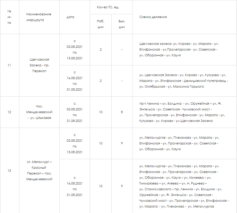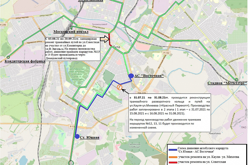 На первом этапе ремонта, чтобы туляки не испытывали неудобств, организуют автобусное движение от от станции Южной до автостанции Восточной. Увеличат количество единиц транспорта на маршруте №55 — на пять. Конечную автобуса №8 перенесут на Красный Перекоп.