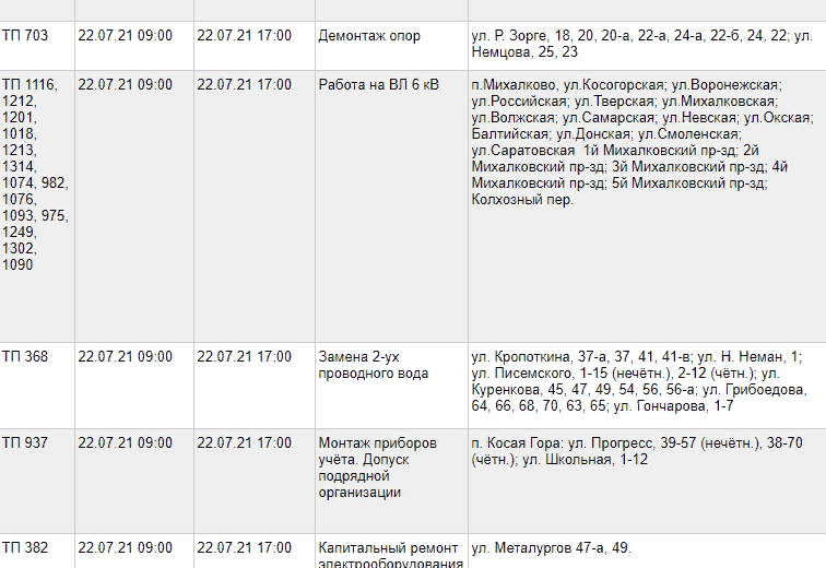 По большинству адресов электричество будет отключено в 9:00. Время подачи света разнится: от 13:30 до 19:00. Профилактика связана с монтажем приборов учета, ремонтом электрооборудования и другими работами.
